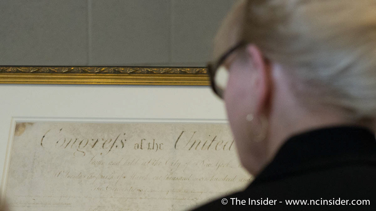 Historic flags, including a Confederate Battle Flag, on display in the House Chamber of the North Carolina State Capitol during a session of the N.C. House on March 18, 2013. The legislature met in the 1840 building to commemorate the state's recovery of its copy of the Bill of Rights, which was removed by Union soldiers in 1865 at the close of the Civil War.